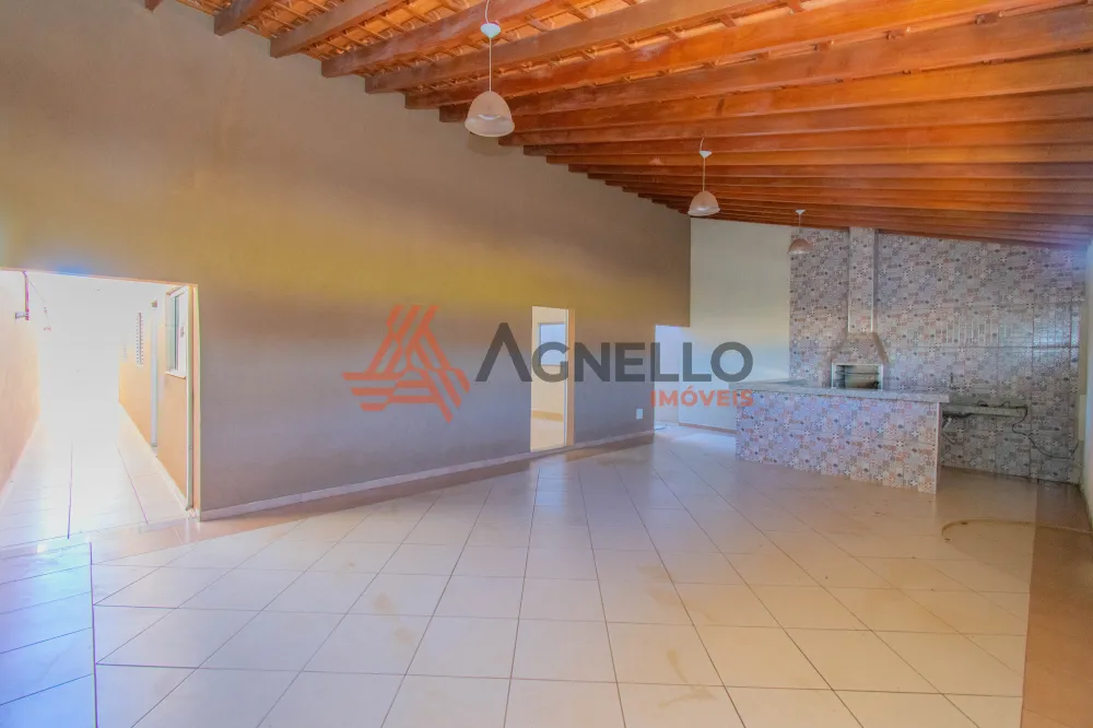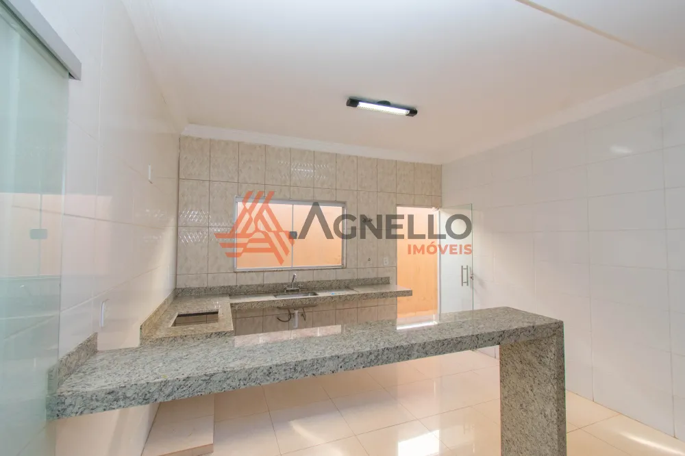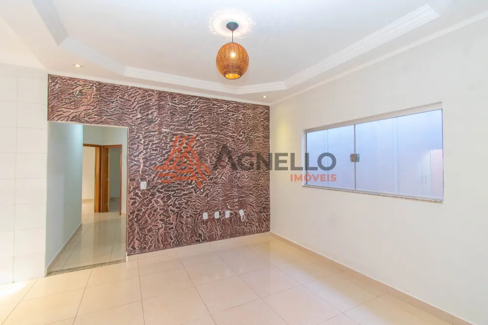 Casa com três dormitórios sendo uma suíte, sala de estar e cozinha com balcão americano, banheiro social, piso em porcelanato. Lavanderia coberta, varanda gourmet com churrasqueira, balcão e pia; garagem coberta para dois carros com portão basculante.