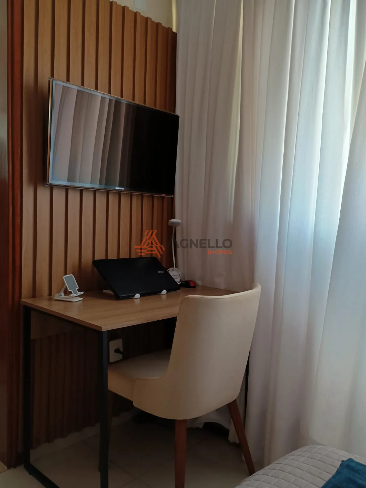 Nesse apartamento há uma suíte ampla e dois dormitórios com armários, cozinha americana integrada com a sala de jantar, sala de tv e um banheiro.