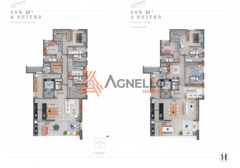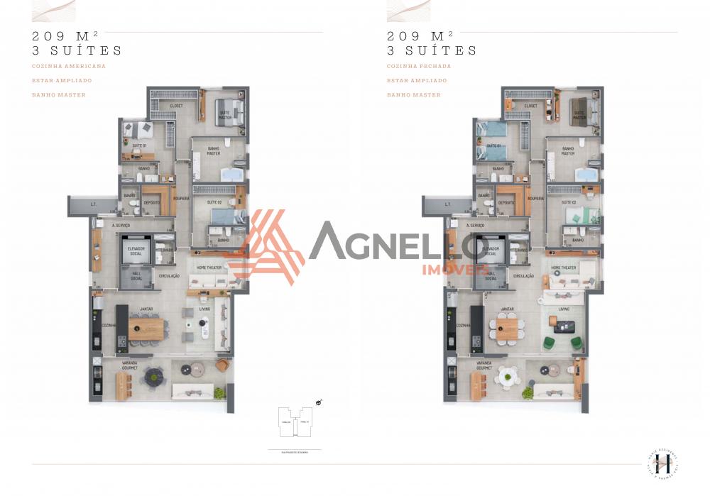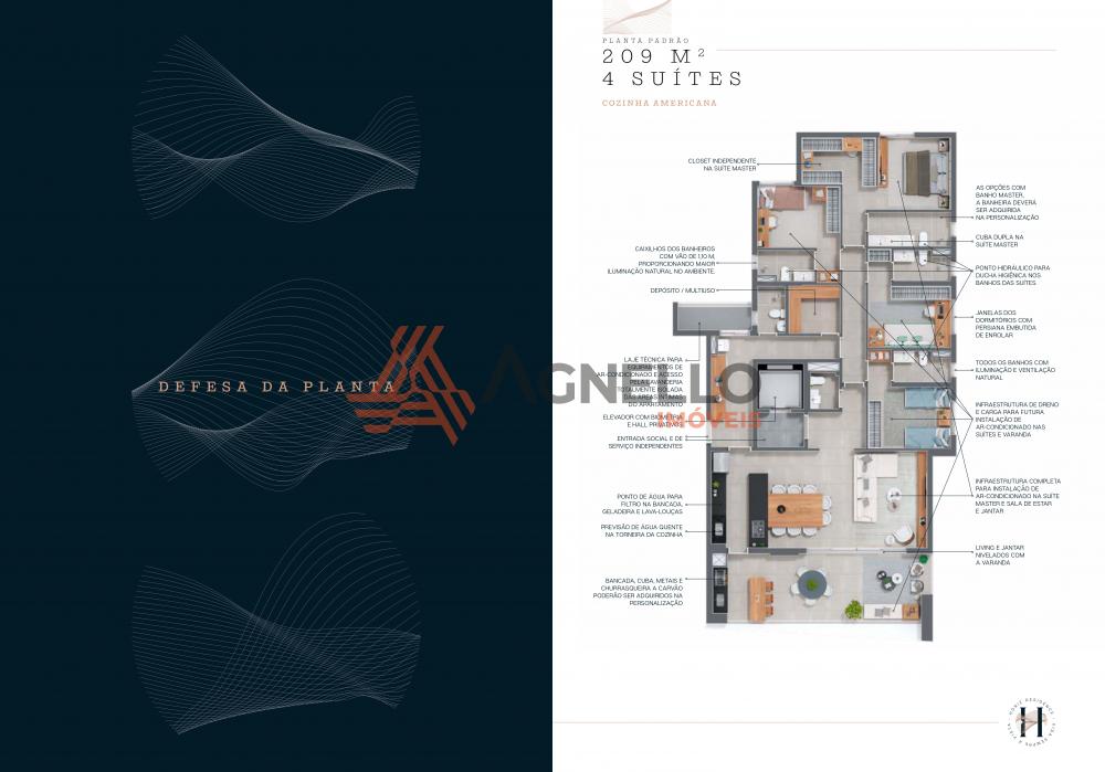 Apartamento com 3 suítes, salas de estar, jantar e TV, lavabo, cozinha americana, área de serviço com deposito e banheiro, varanda gourmet e 3 vagas de garagem.