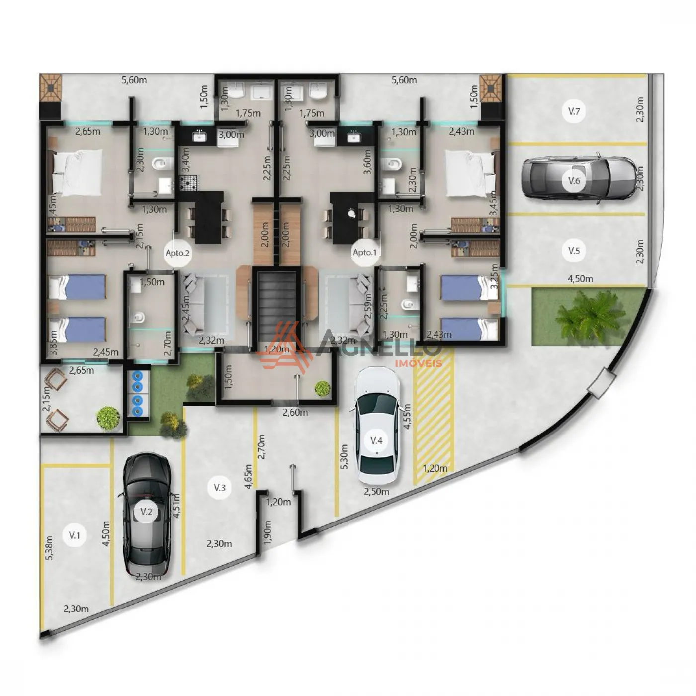 Com dois dormitórios sendo uma suíte, sala, cozinha, banheiro social, lavanderia e garagem.
