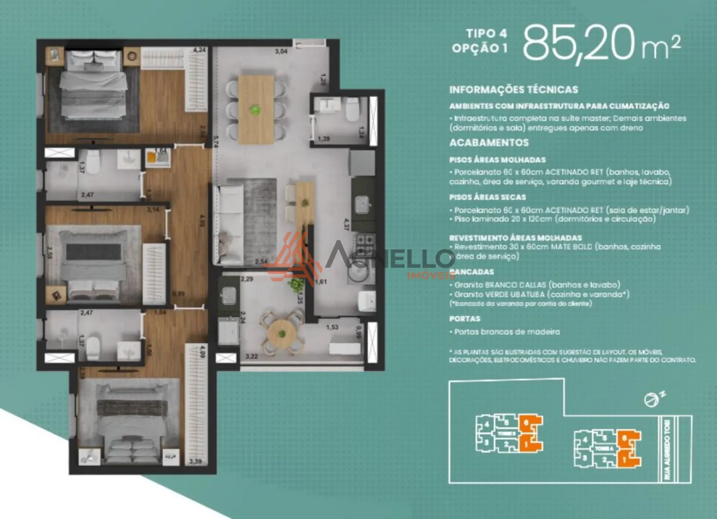 Apartamento na planta, com 3 dormitórios, sendo 1 suíte, Sala de TV e jantar, cozinha americana, área de serviço, lavabo, varanda gourmet e 2 vagas de garagem. Ambientes com infraestrutura para climatização.