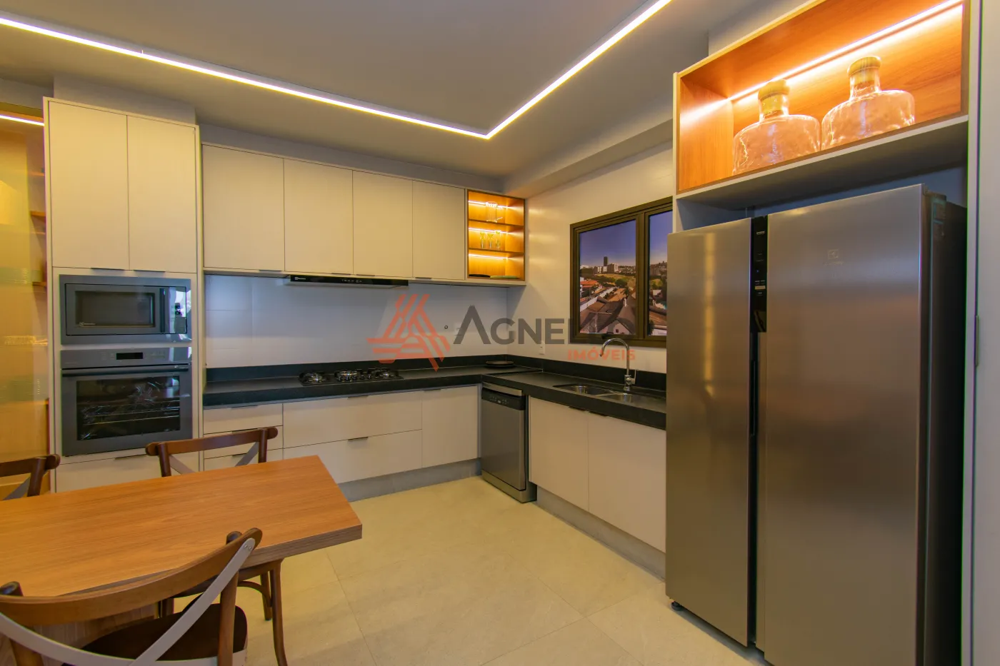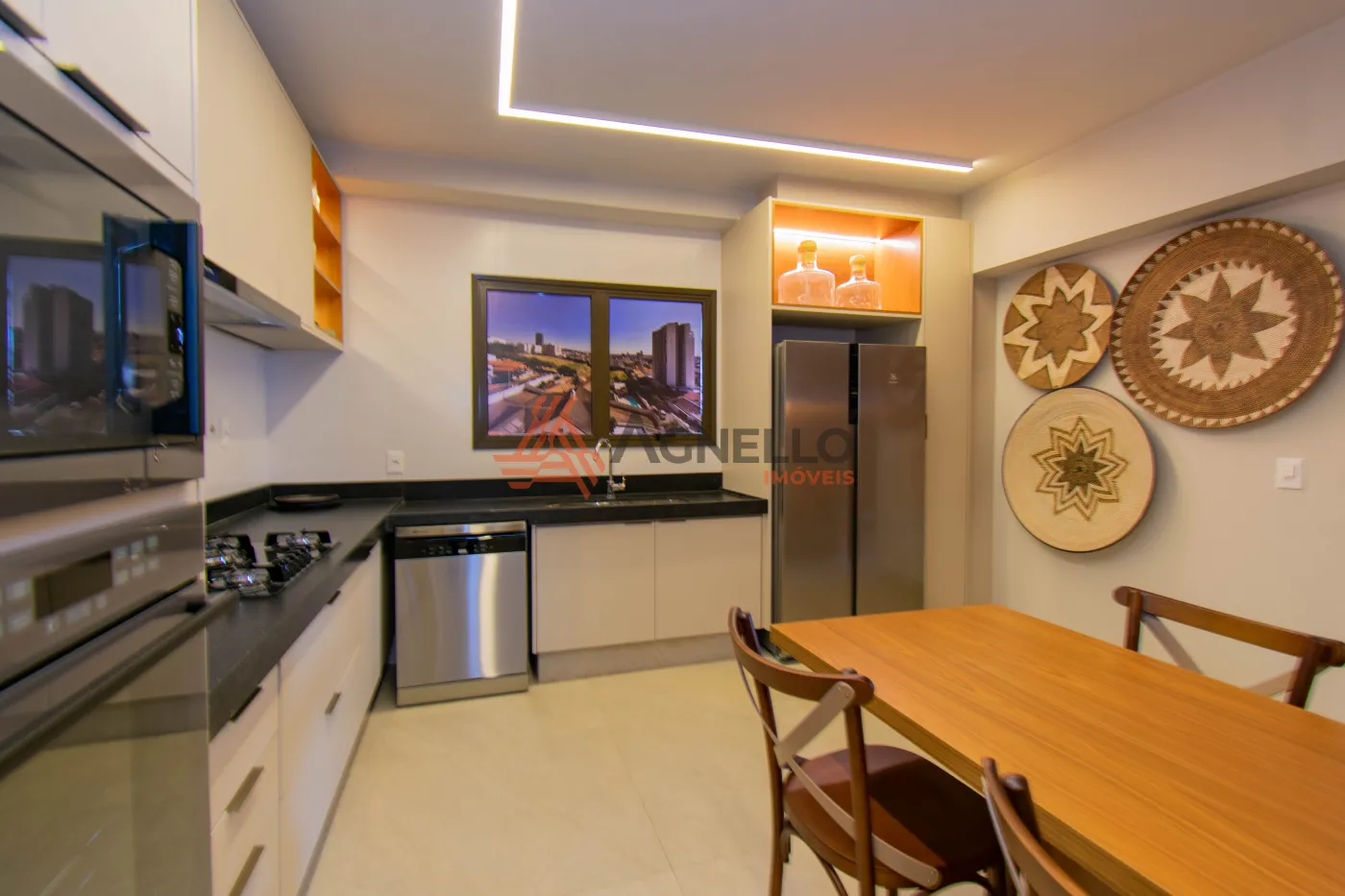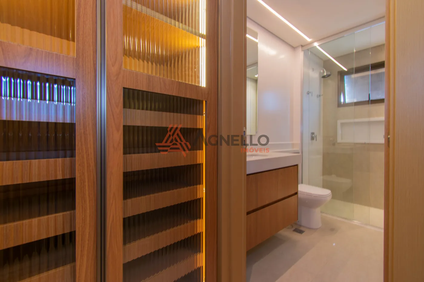 Apartamentos com quatro suítes, sendo uma master com closet e sacada, salas de estar, jantar e tv, lavabo, varanda gourmet, cozinha, área de serviço com banheiro e três vagas de garagem.