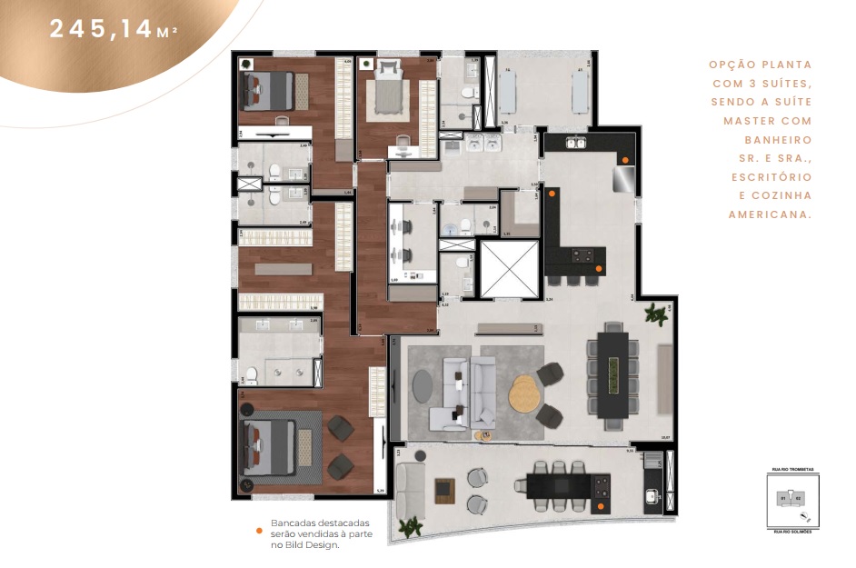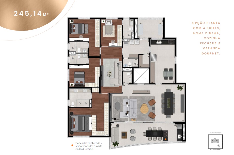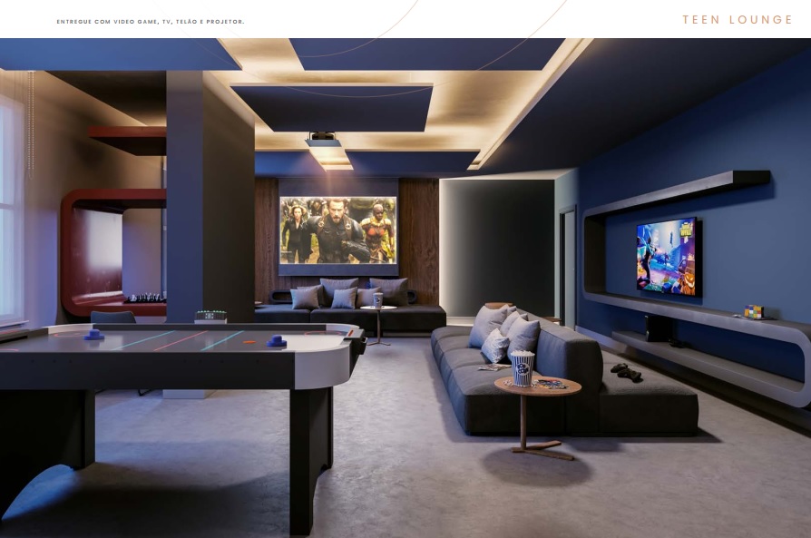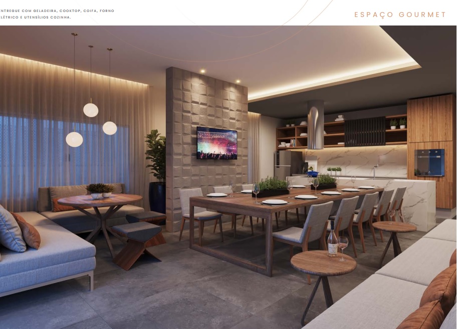 Opções com quatro suítes, home cinema, cozinha fechada e varanda gourmet ou três suítes, sendo a master com banheiro Sr. e Sra., escritório e cozinha americana. Ambos com quatro vagas de garagem cobertas.