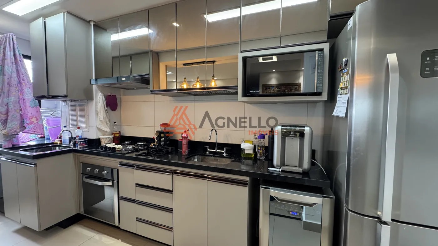 Apartamento de alto padrão, com fino acabamento, semi modulado. Possuindo 3 dormitórios com armários sendo uma suíte, banheiro social, sala para 2 ambientes, lavabo, cozinha americana completa com armários, cooktop, coifa, geladeira, micro-ondas, lava-louças e forno embutido, área de serviços, varanda gourmet com churrasqueira e 2 vagas de garagem.