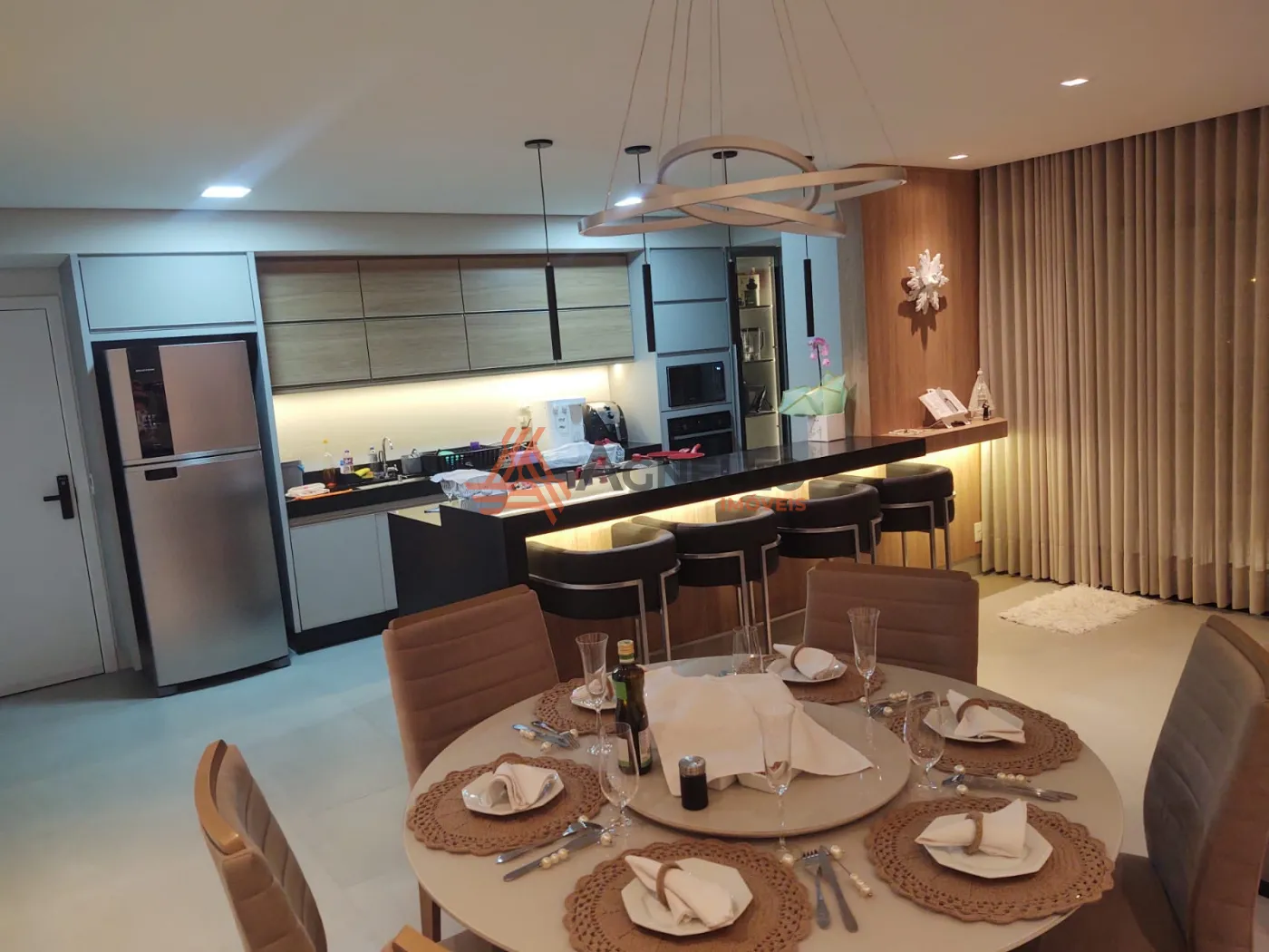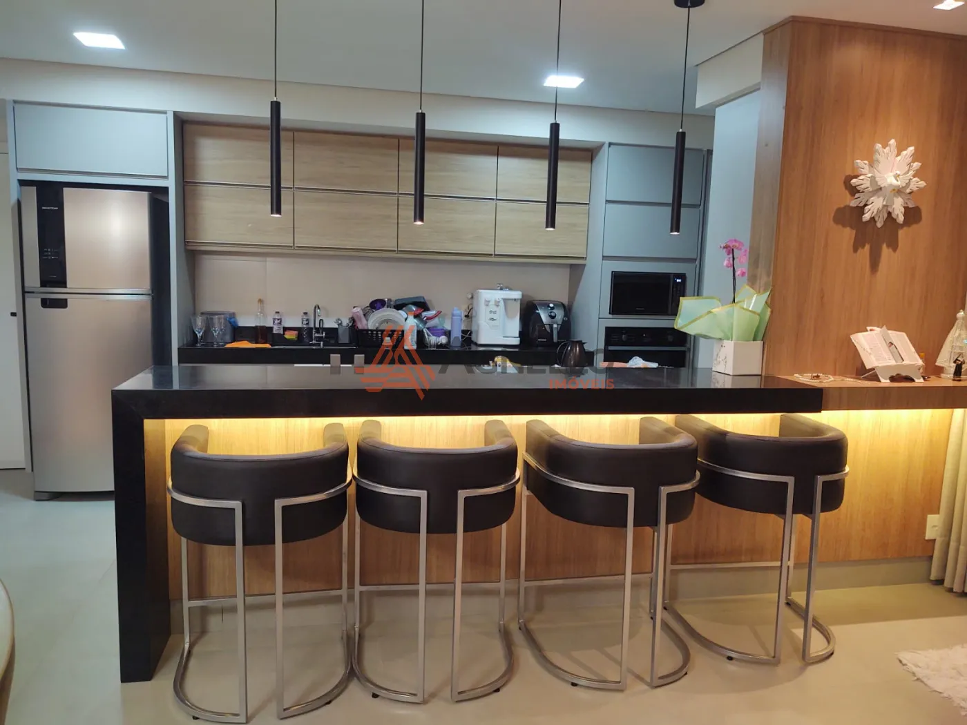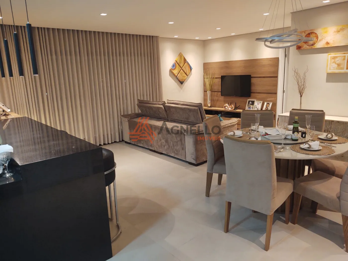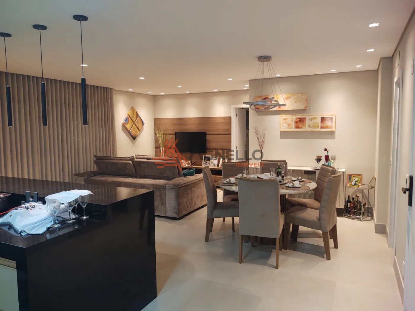 Imóvel rico em móveis planejados, com três suítes, sala com três ambientes, jantar, living e TV, lavabo, sacada, área de serviço com banheiro, cozinha e três vagas de garagem.