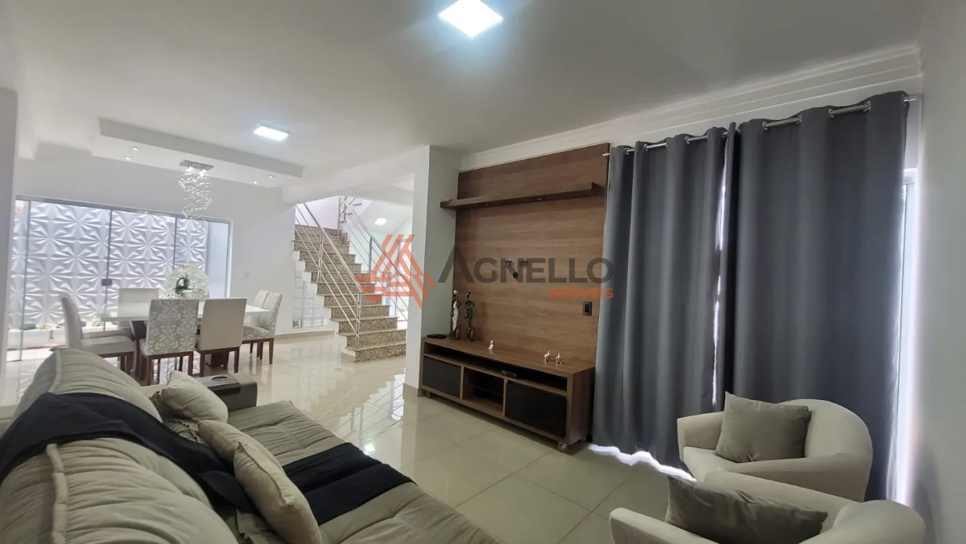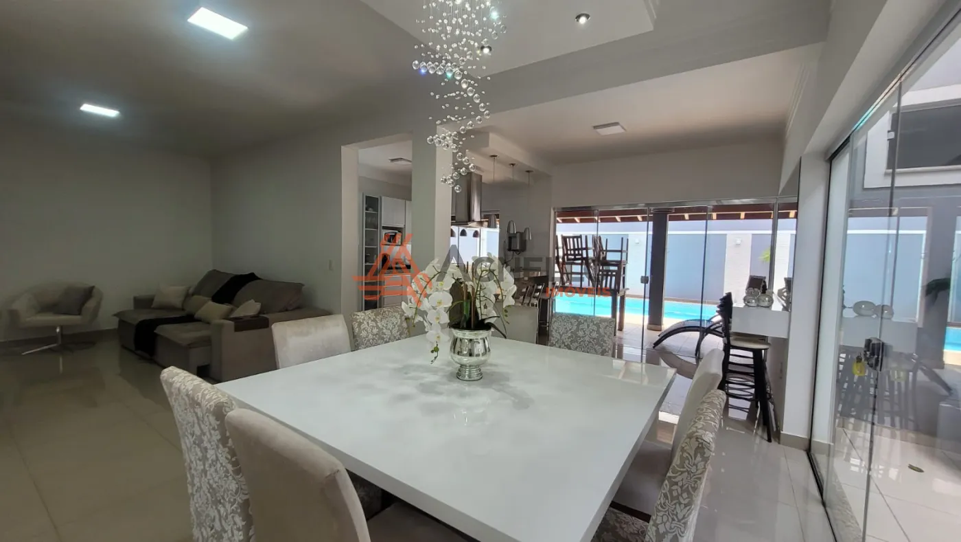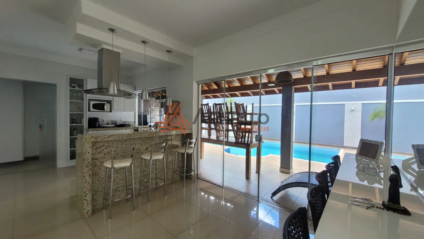 Casa com ótimo acabamento, móveis planejados, três suítes sendo uma com closet e sacada, salas de estar, jantar e TV, cozinha, varanda gourmet, piscina e garagem coberta.
