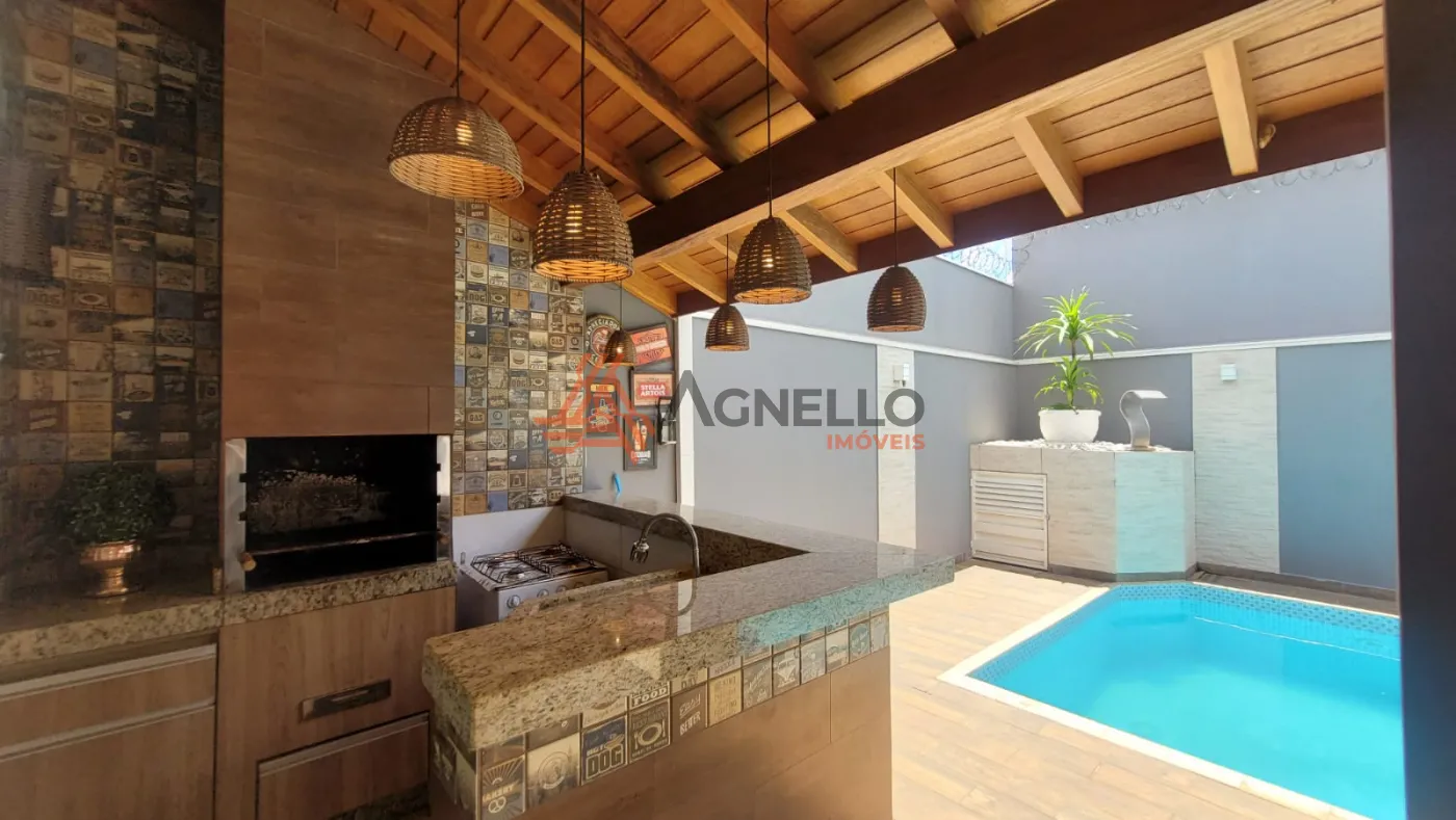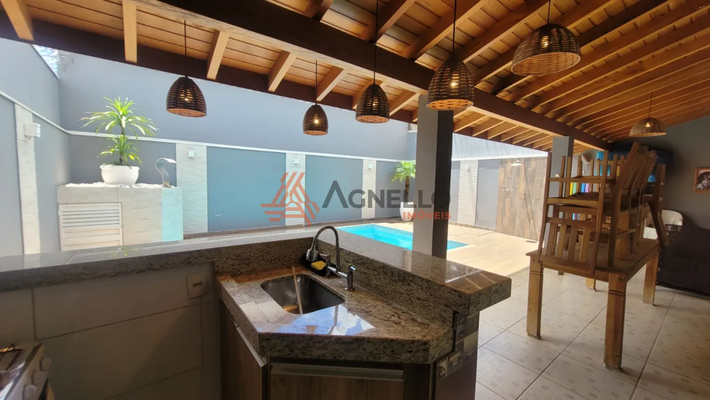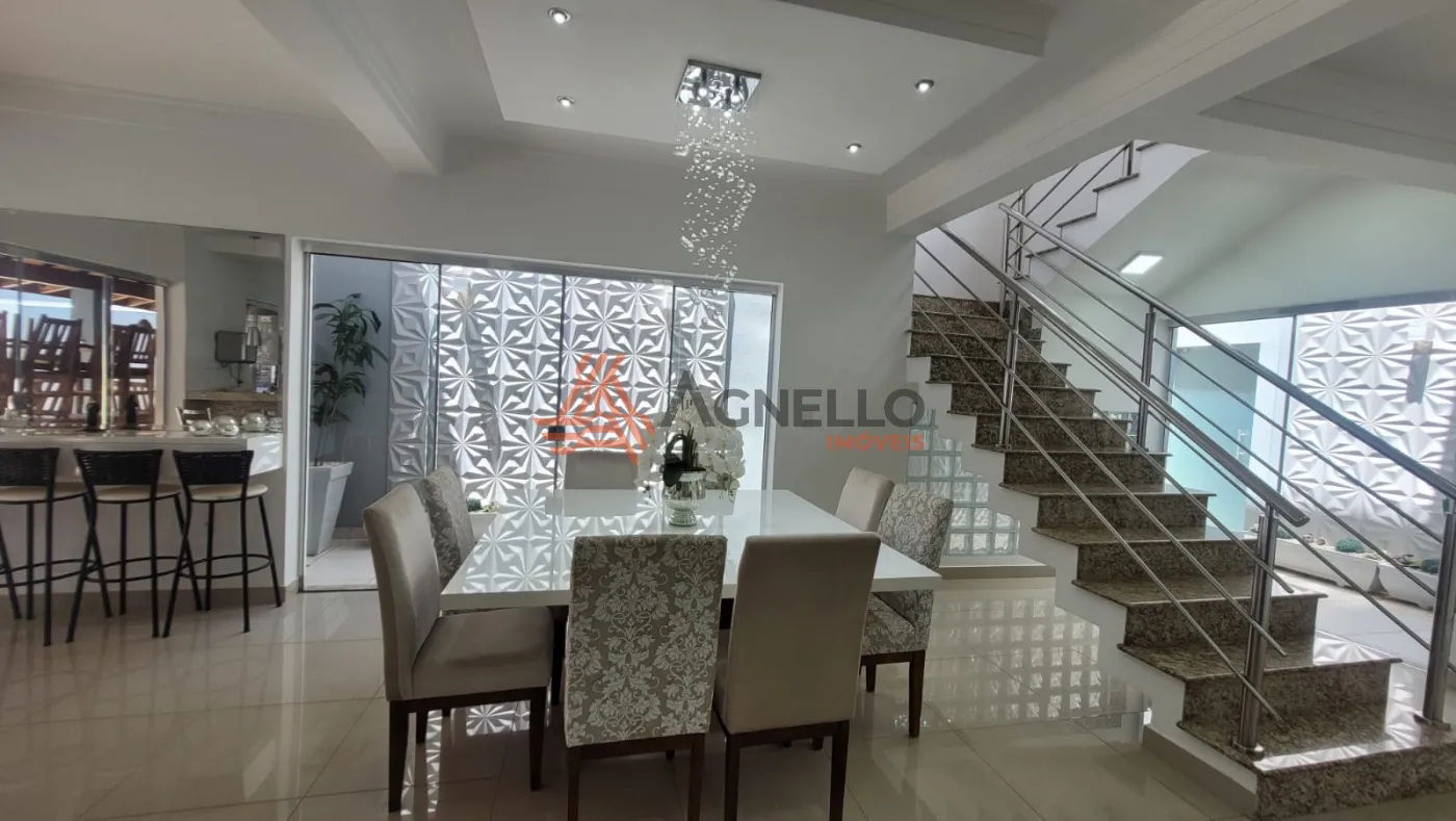 Casa com ótimo acabamento, móveis planejados, três suítes sendo uma com closet e sacada, salas de estar, jantar e TV, cozinha, varanda gourmet, piscina e garagem coberta.