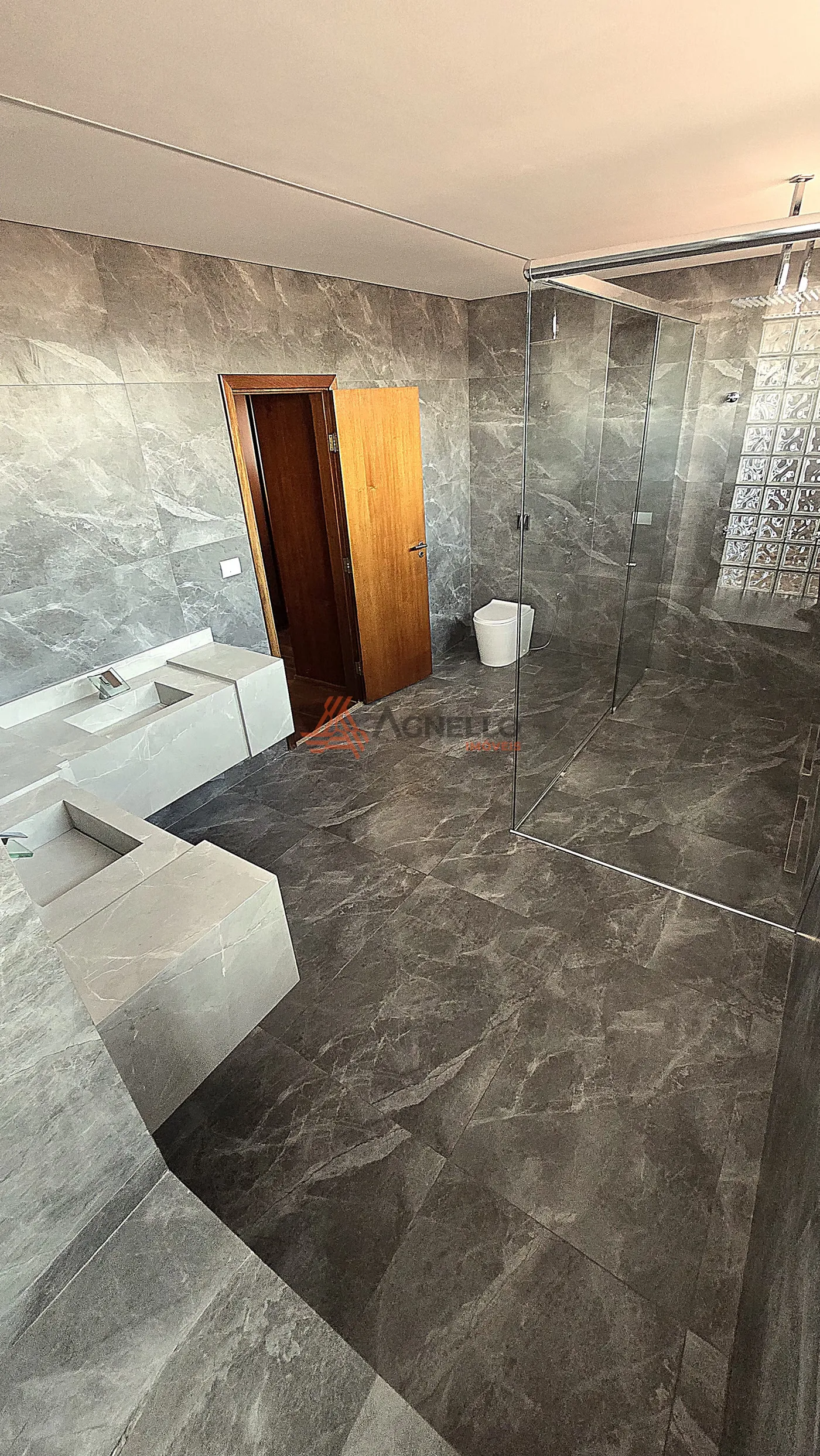 No primeiro andar, a área íntima dispõe de quatro dormitórios bem distribuídos: uma demi-suíte (dois quartos com banheiro compartilhado), uma suíte master com amplo closet e banheiro com cuba dupla e dois chuveiros, além de outra suíte com closet. O pavimento também conta com escritório/sala adicional, amplo roupeiro no corredor e uma varanda espaçosa com vista para o terraço e o jardim.