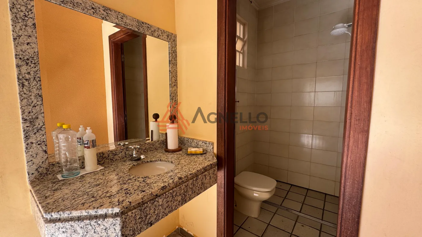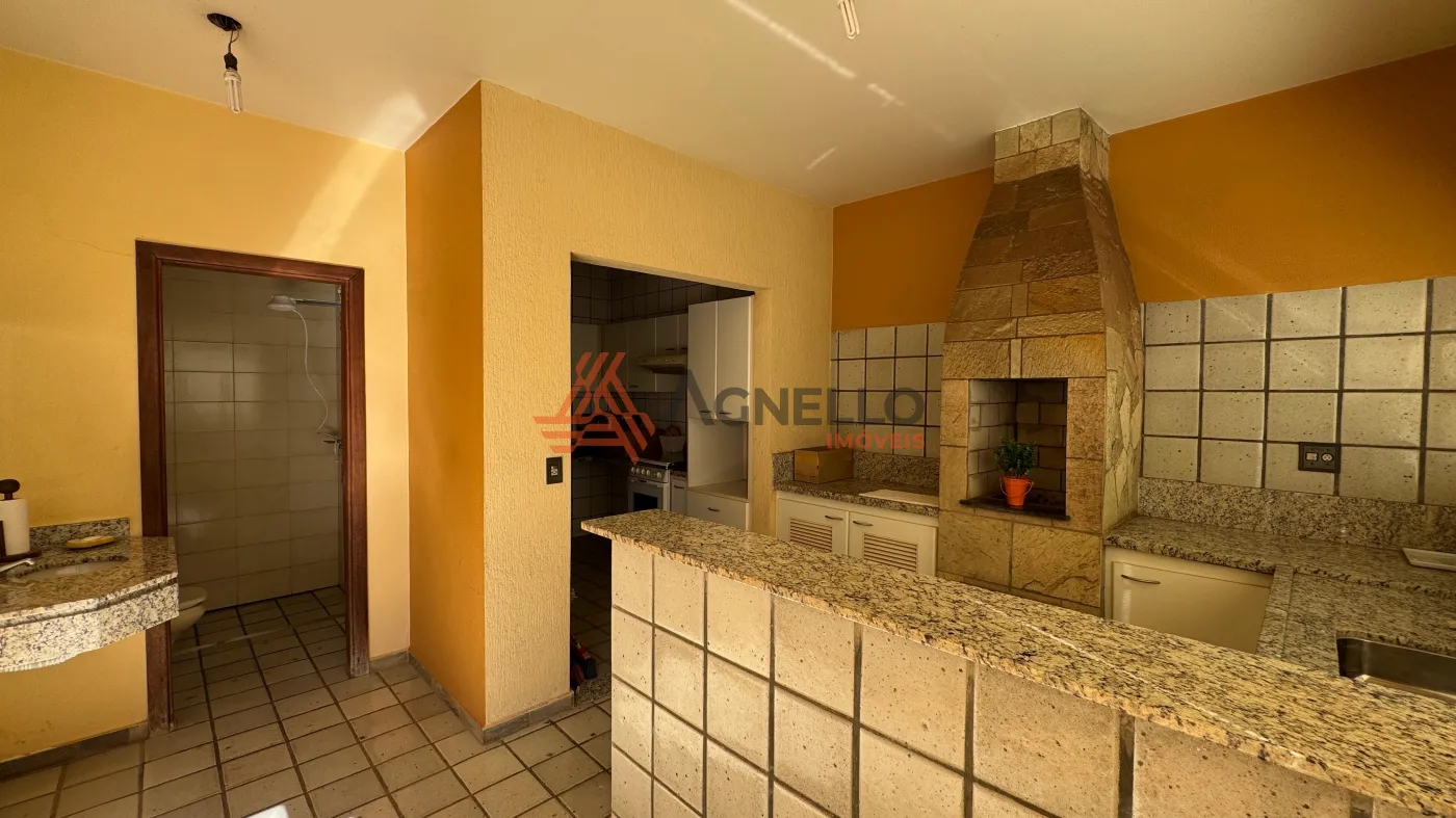 Varanda gourmet com churrasqueira, banheiro de apoio e piscina em alvenaria,