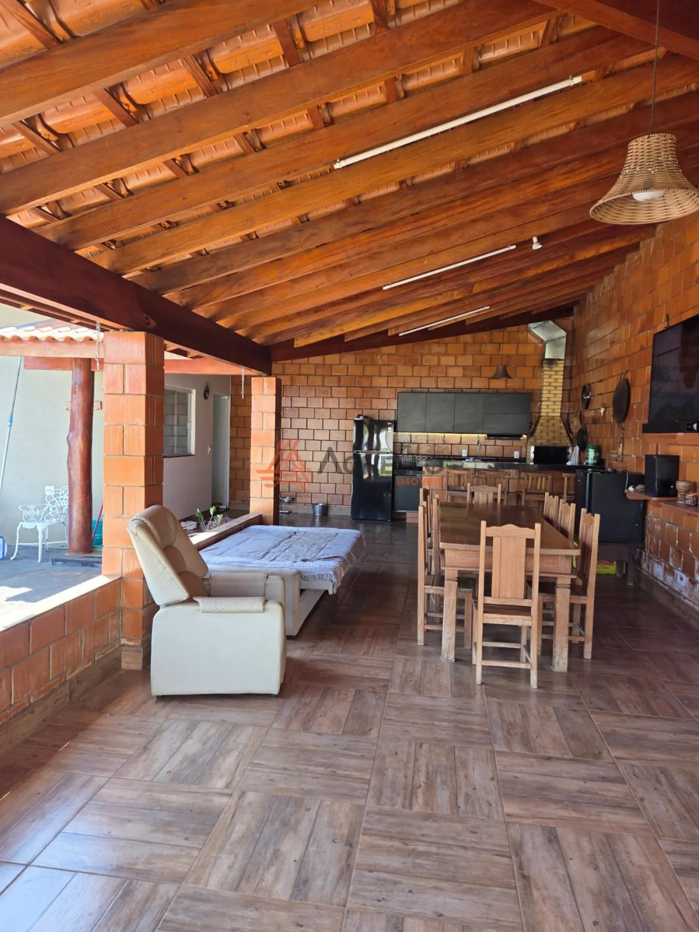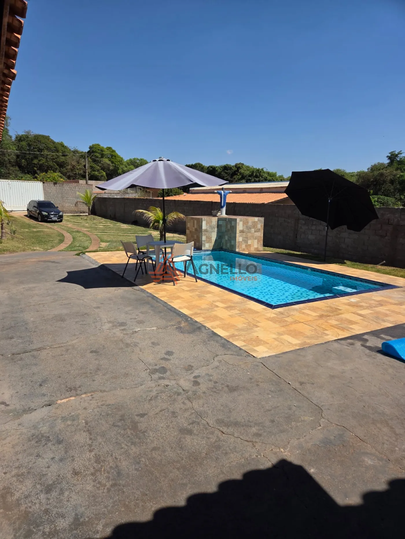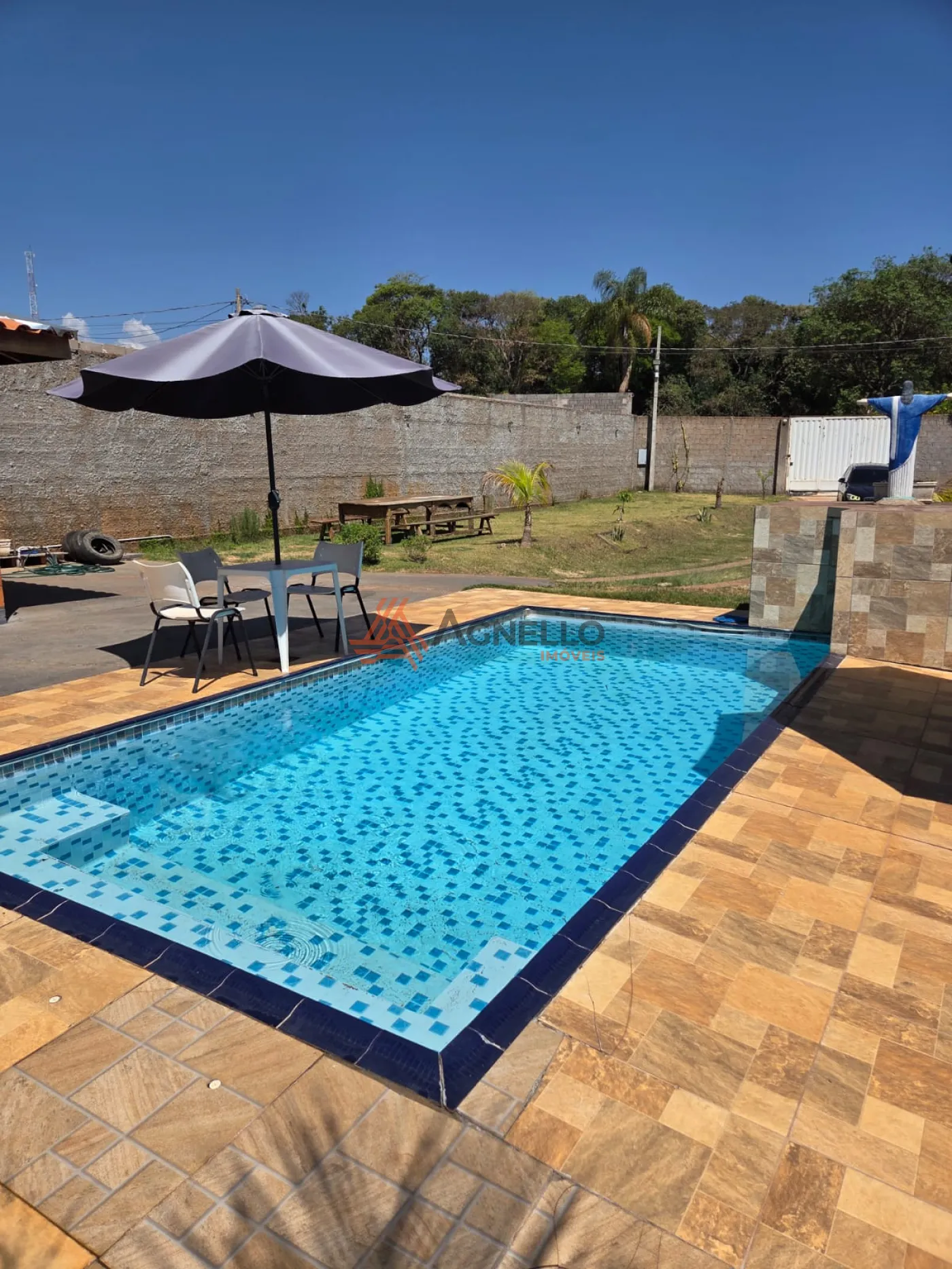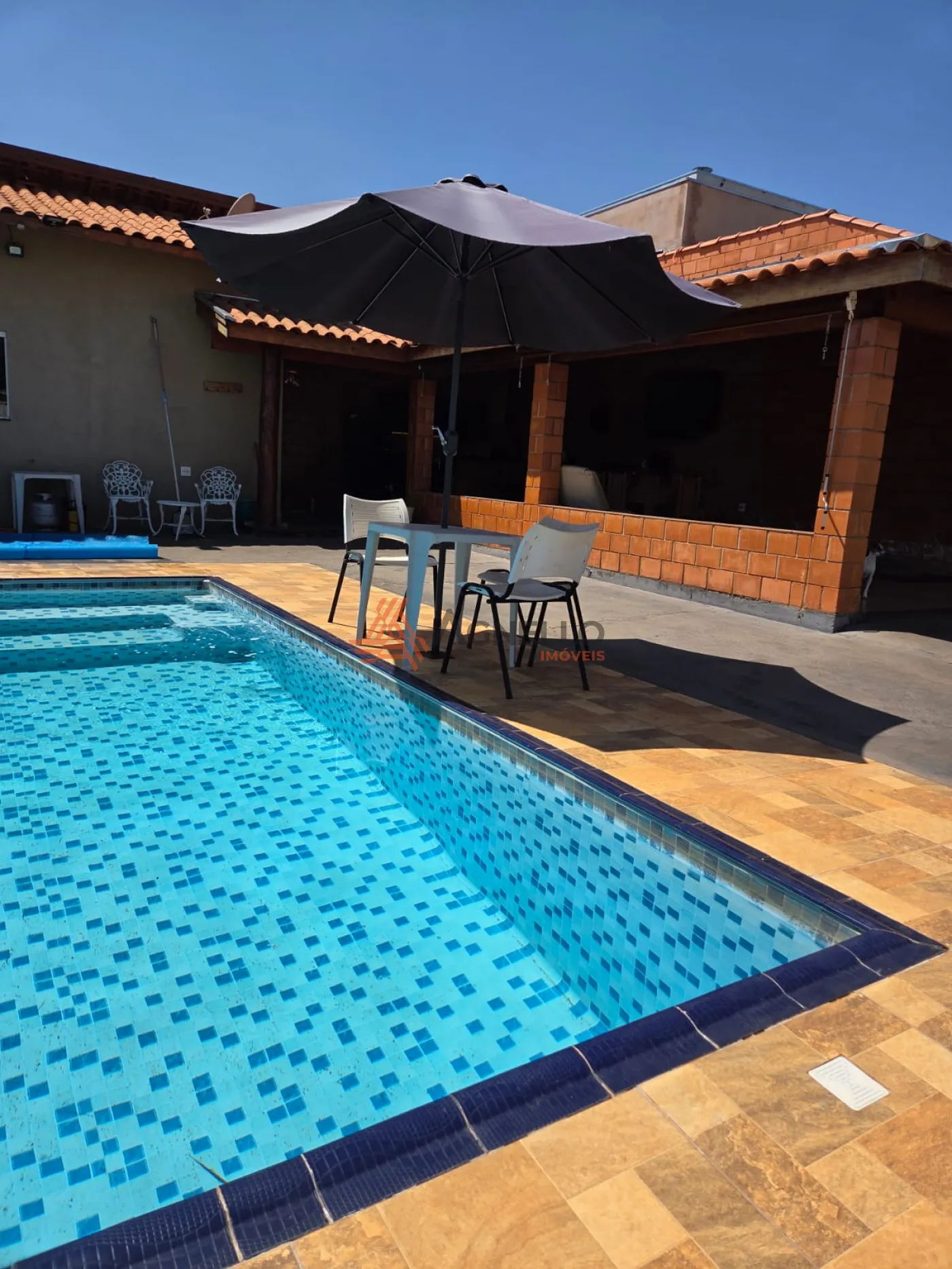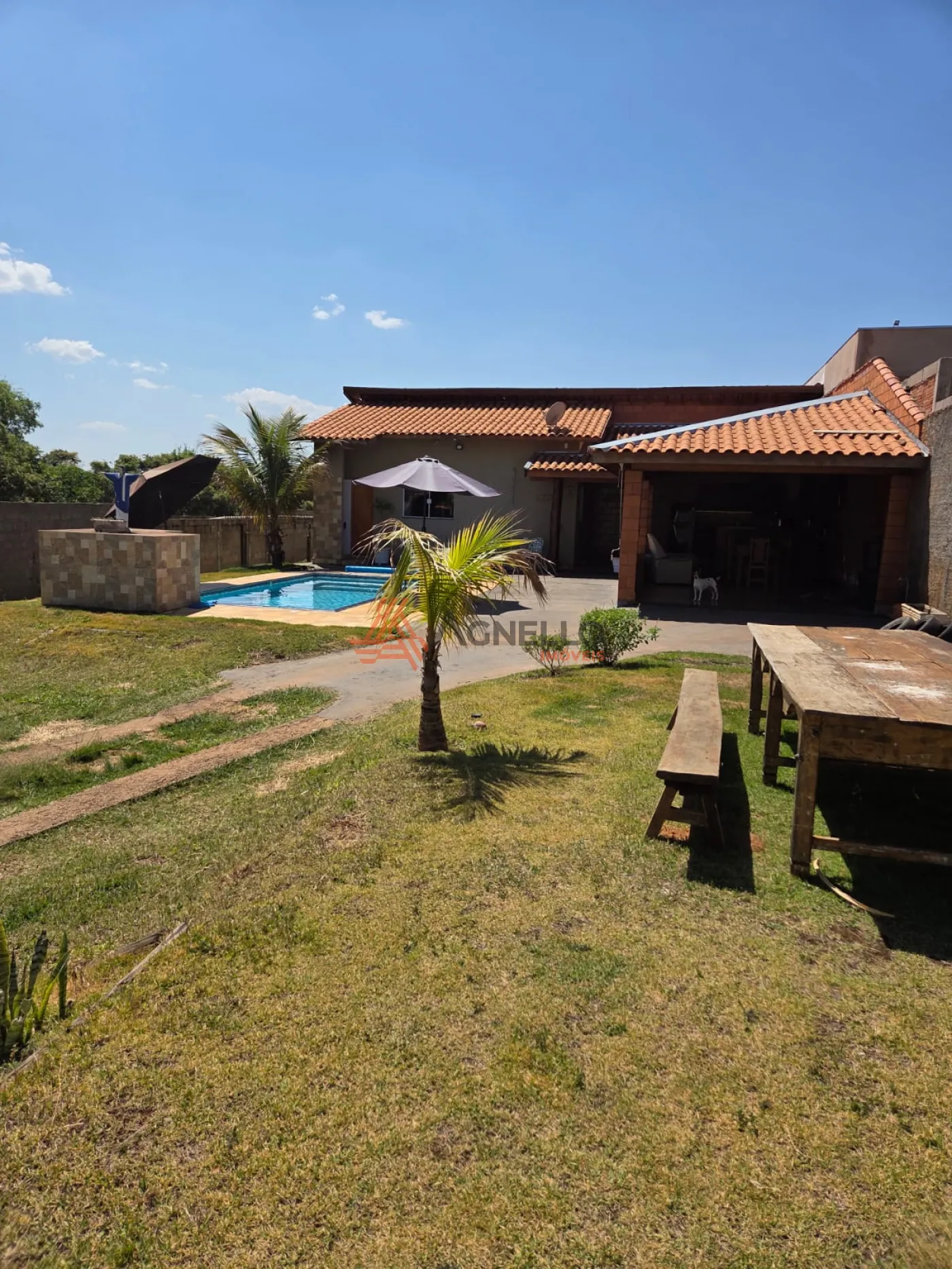 Chácara com ótima área de lazer com piscina, varanda gourmet com churrasqueira, sala, cozinha com armários e despensa, 2 banheiros sociais, 3 dormitórios, sendo 1 suíte e ampla área externa.