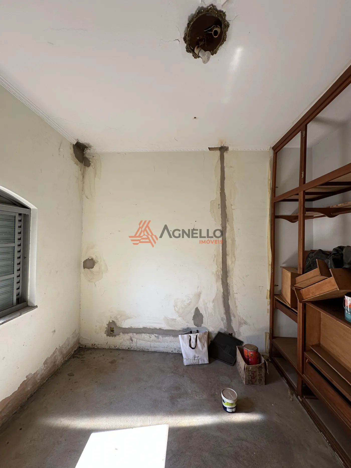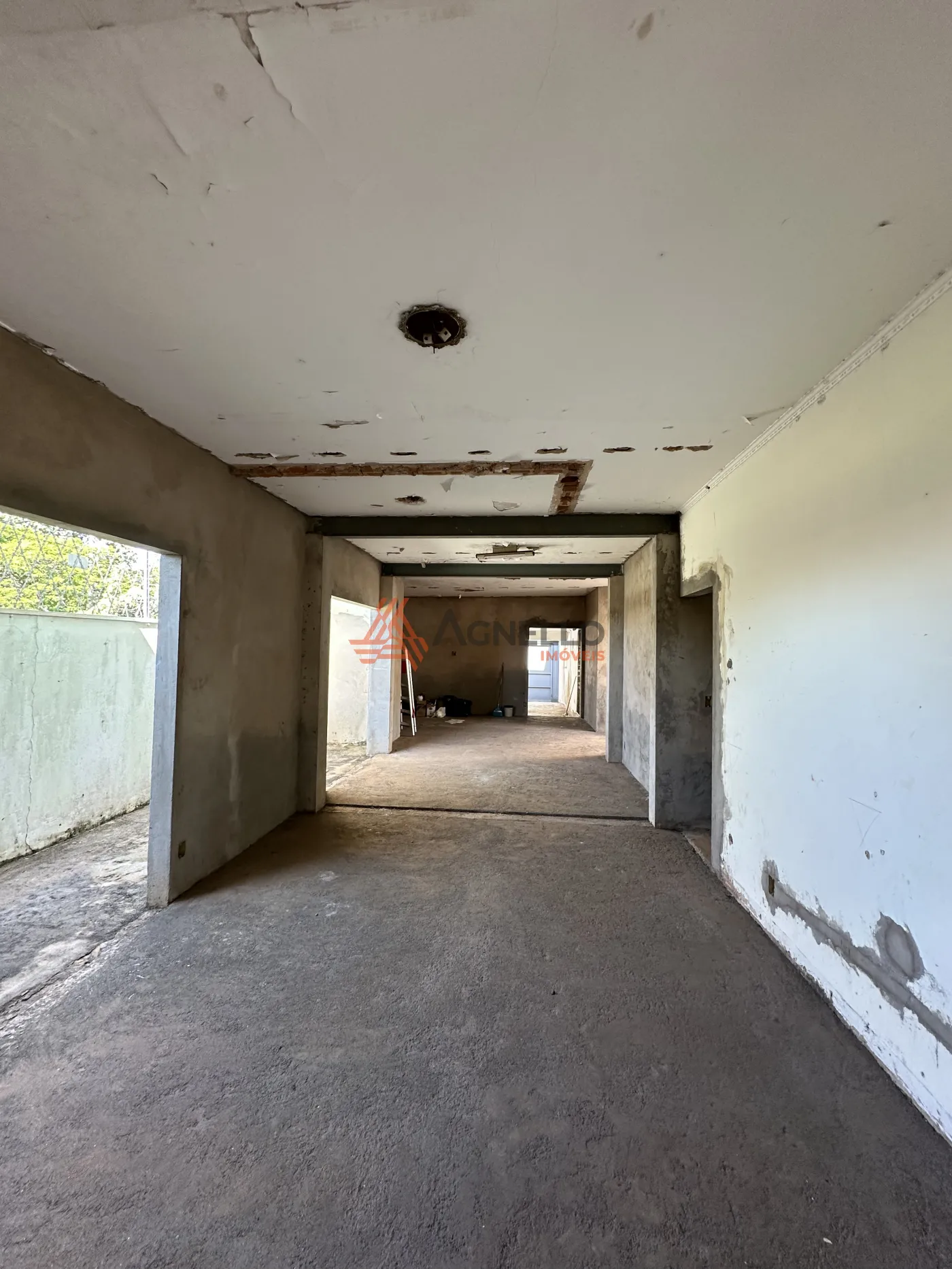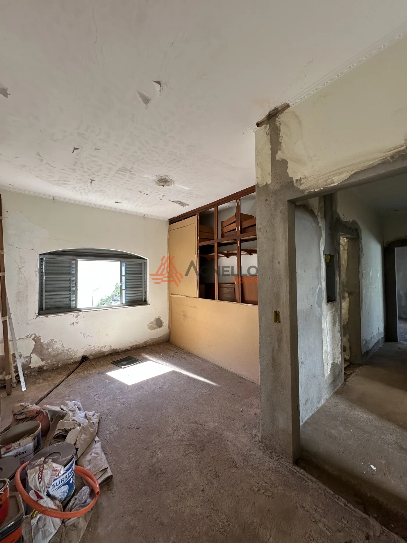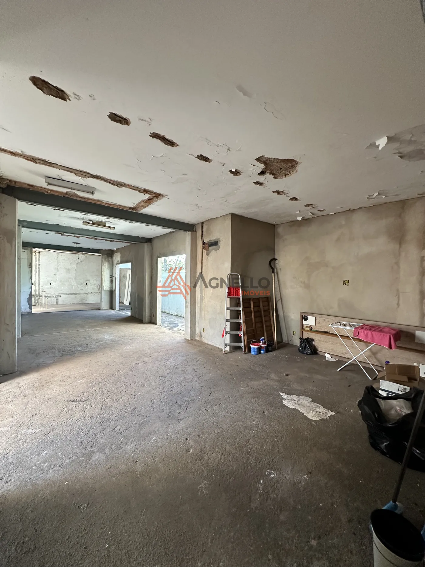 Parte residencial para reforma, com três dormitórios sendo uma suíte, ampla sala de estar, banheiro social, cozinha, lavanderia, quintal e garagem.