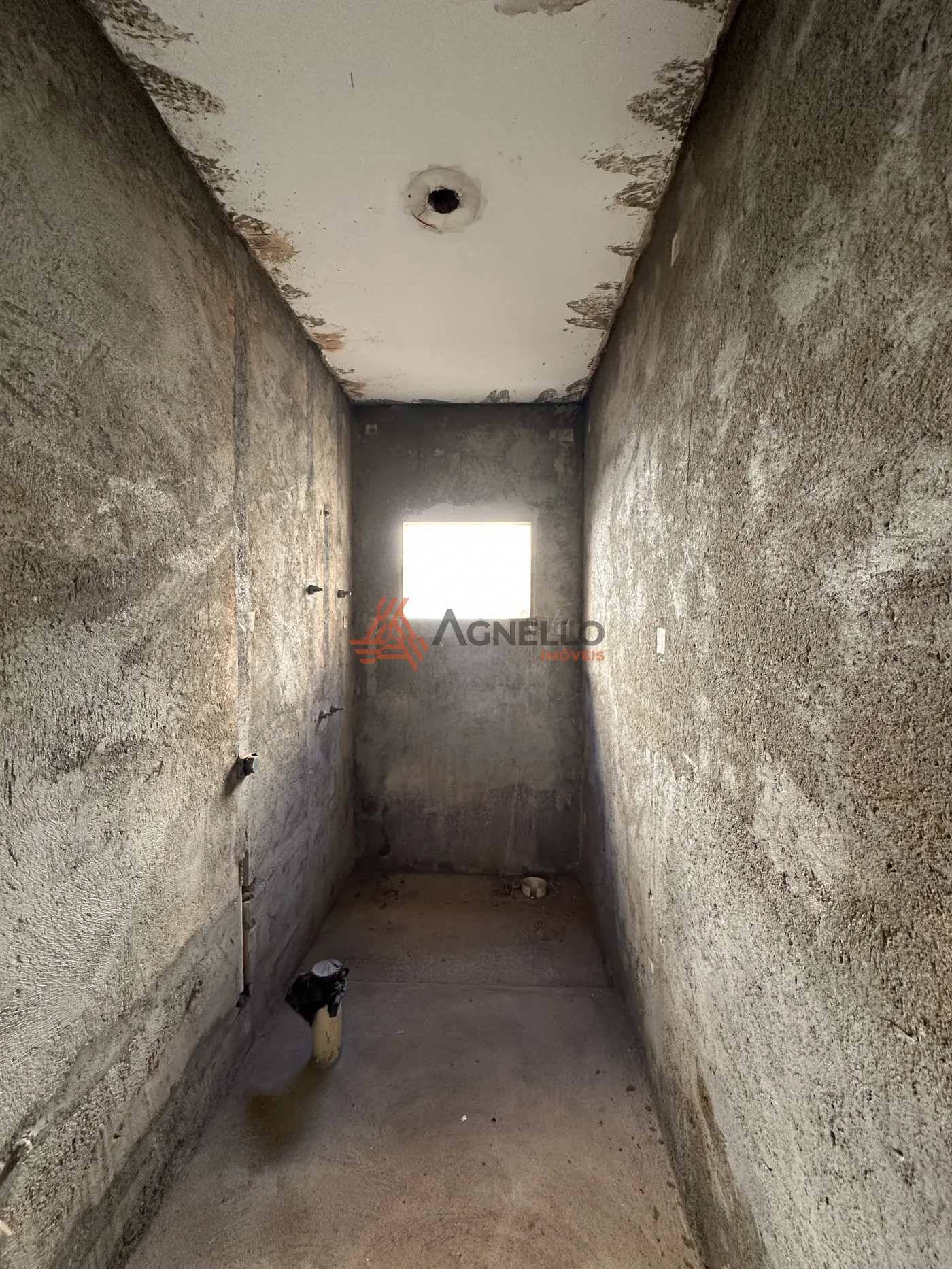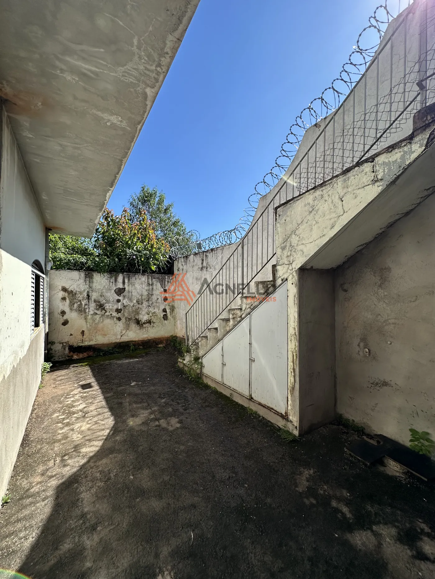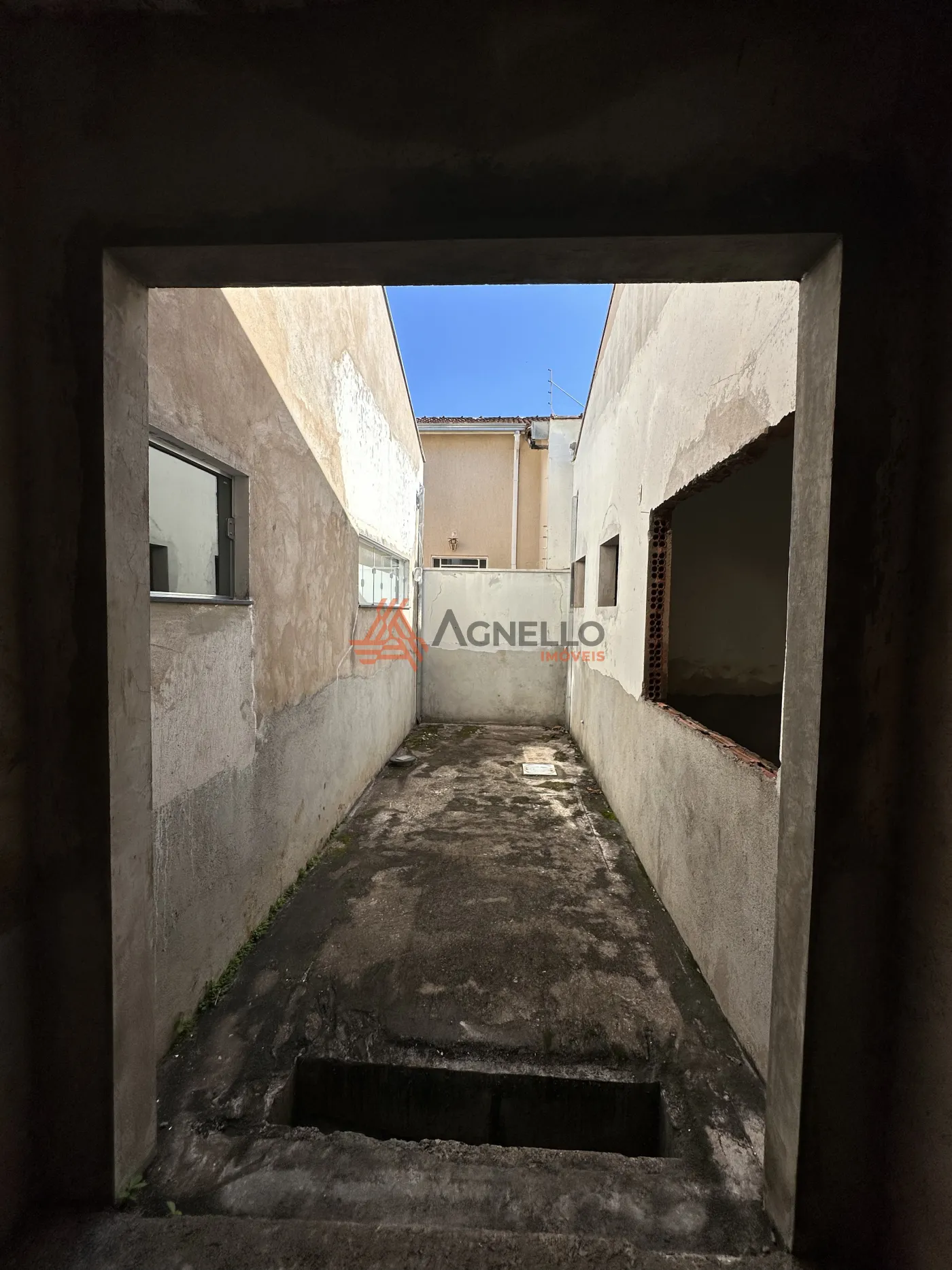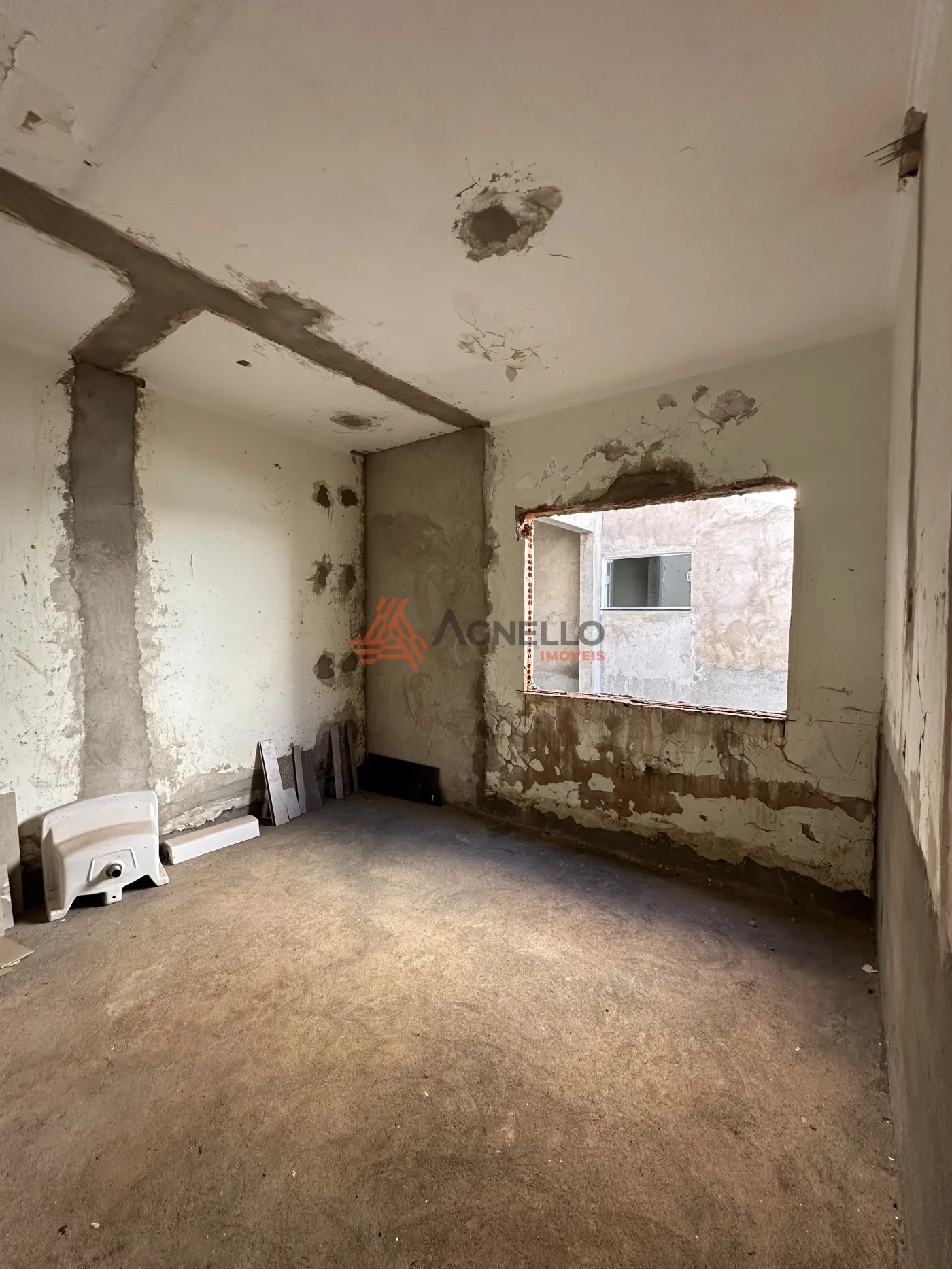 Parte residencial para reforma, com três dormitórios sendo uma suíte, ampla sala de estar, banheiro social, cozinha, lavanderia, quintal e garagem.