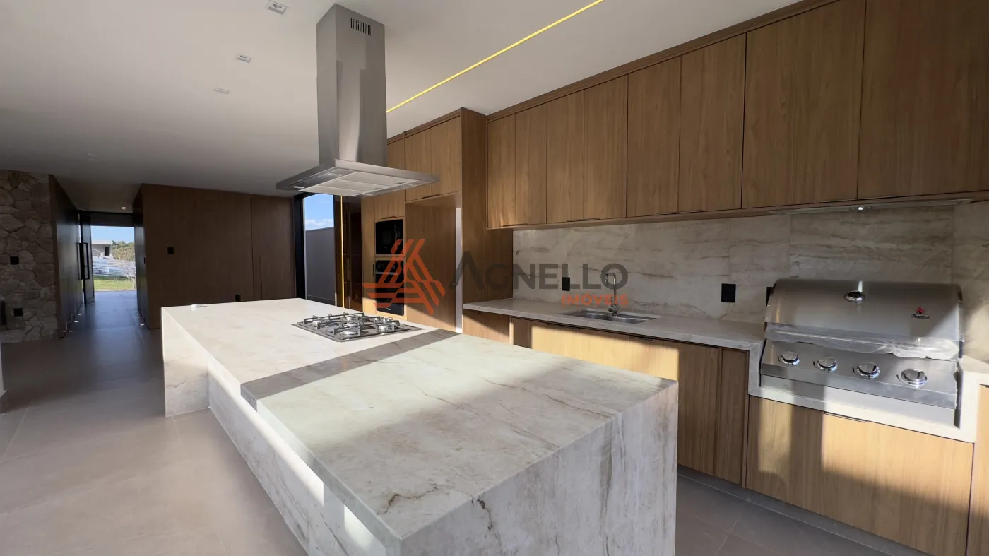 Sala, cozinha e área de lazer integrados. Ilha com cooktop e coifa; torre quente com micro-ondas e forno; dispensa e lavanderia.