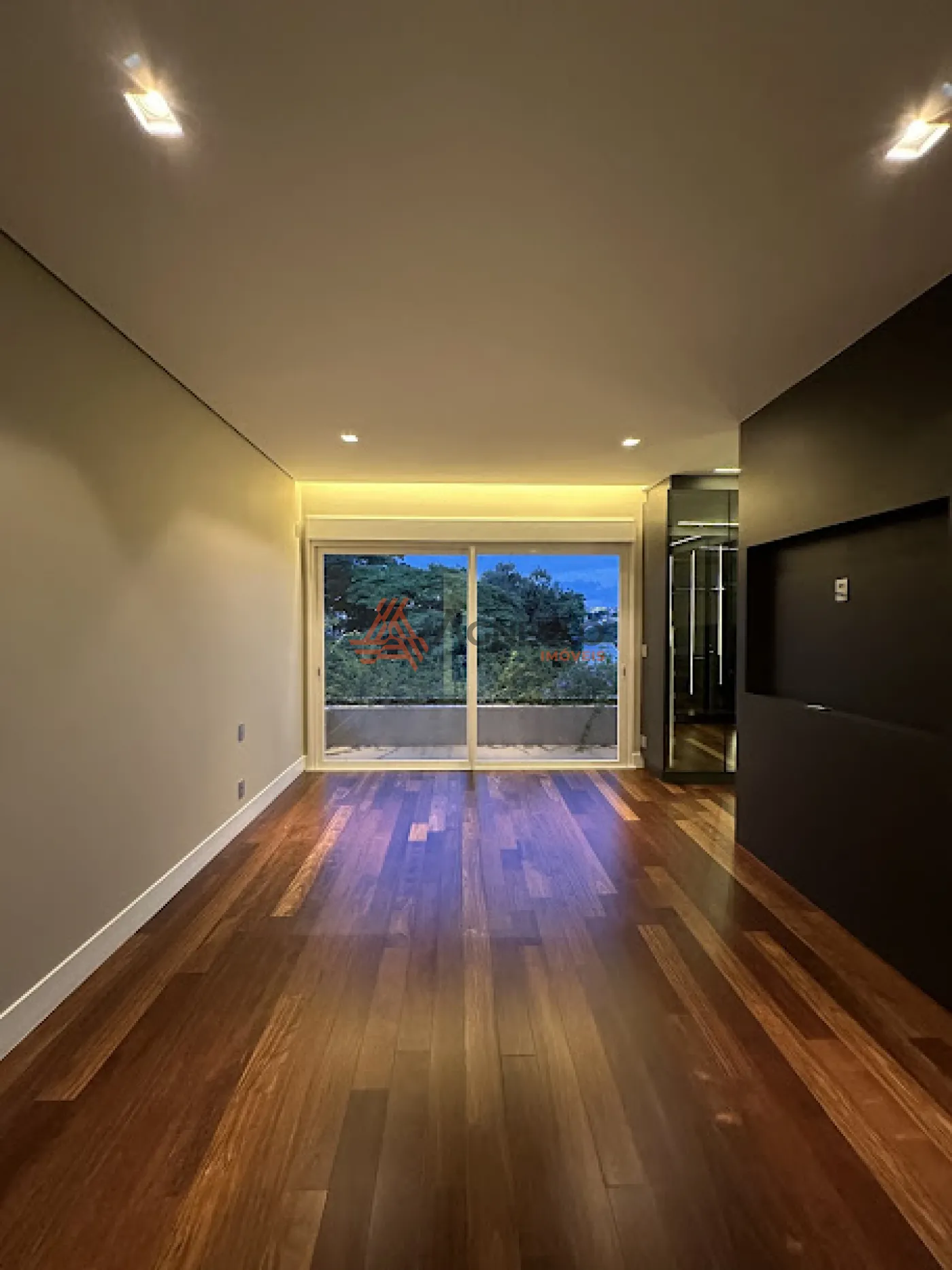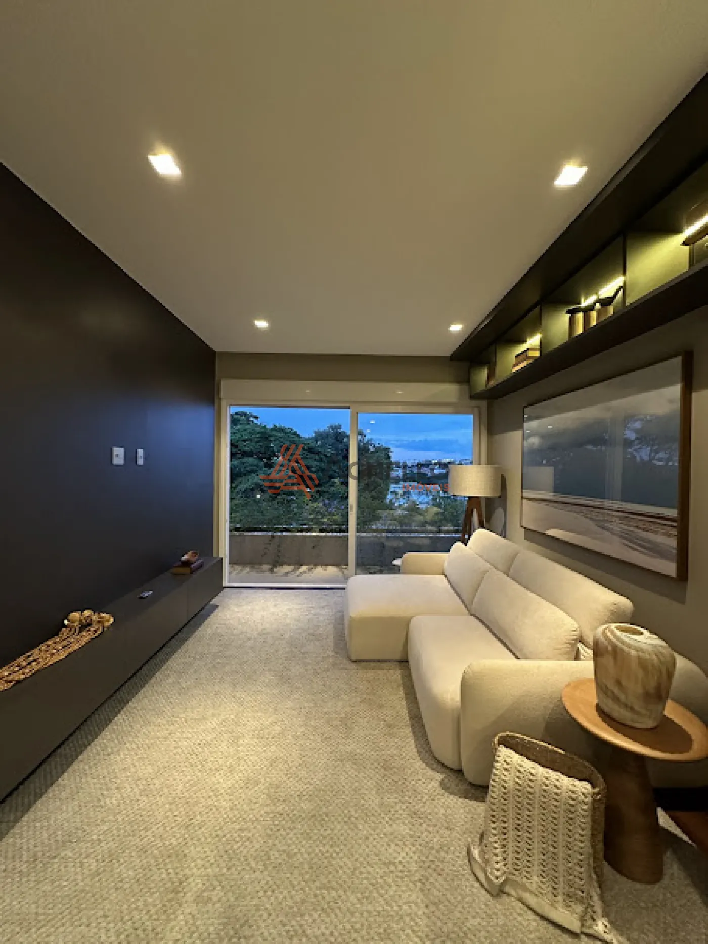 -Sala de tv com estante e painel em marcenaria com vista deslumbrante para a área verde do condominio;