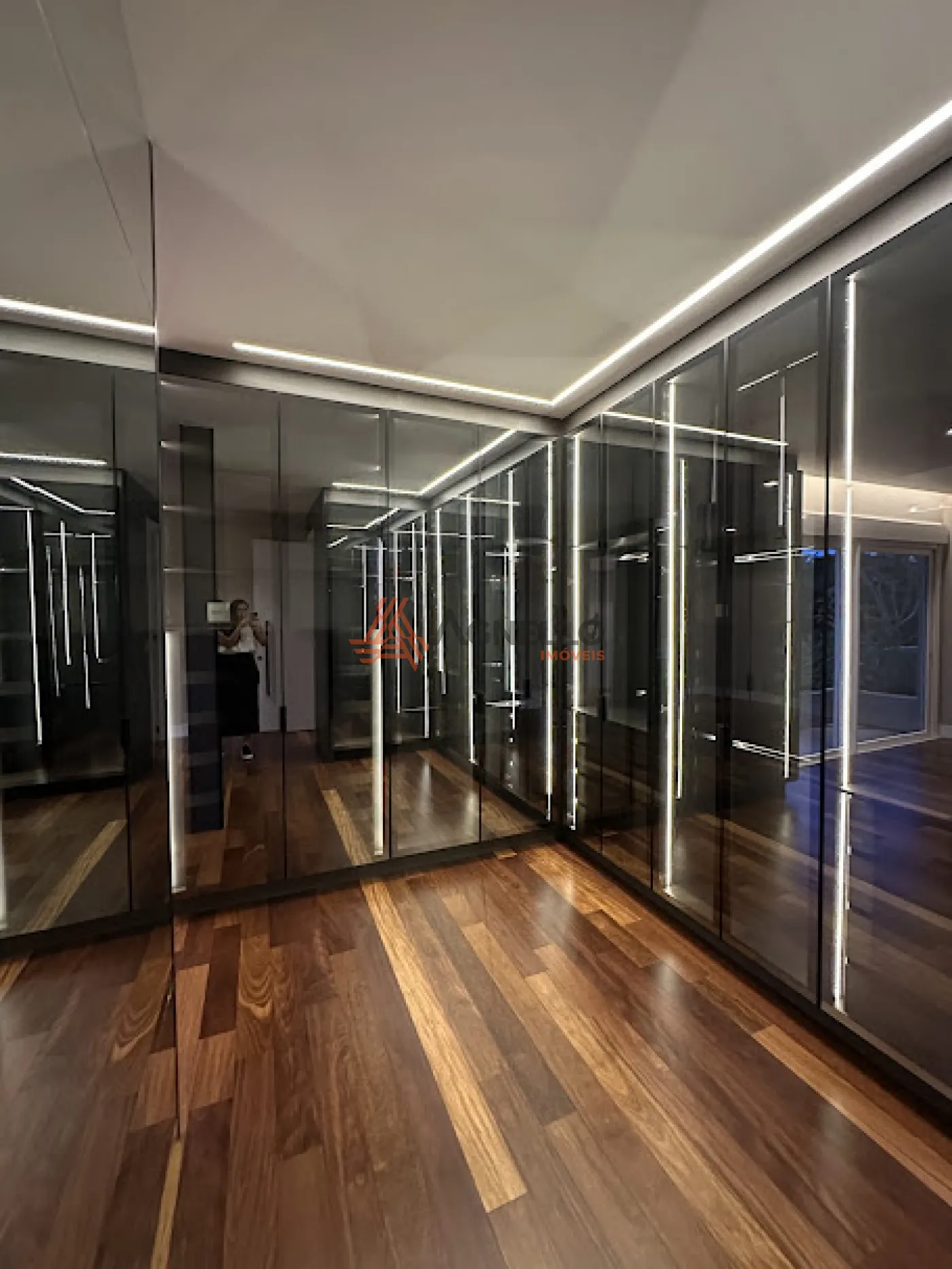 -Guarda roupas com portas de vidro e iluminação em led;