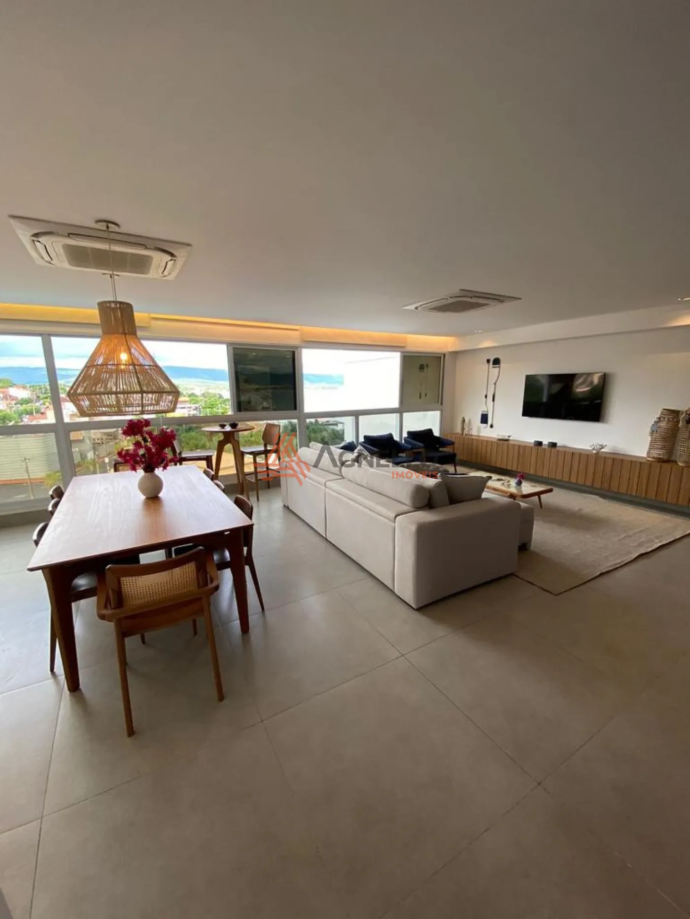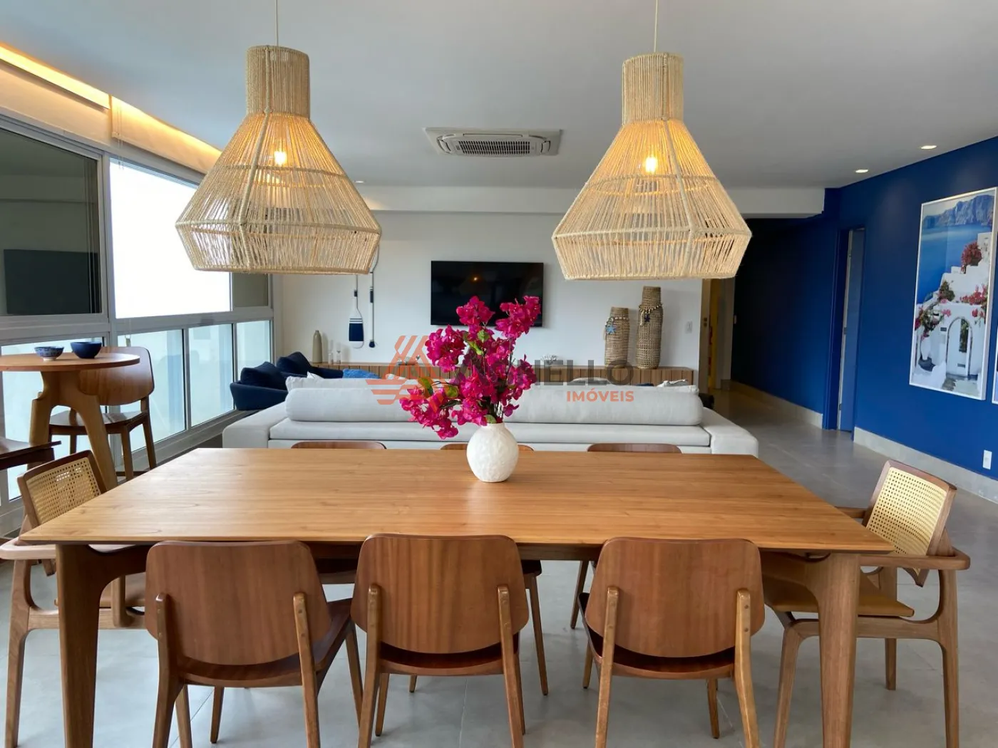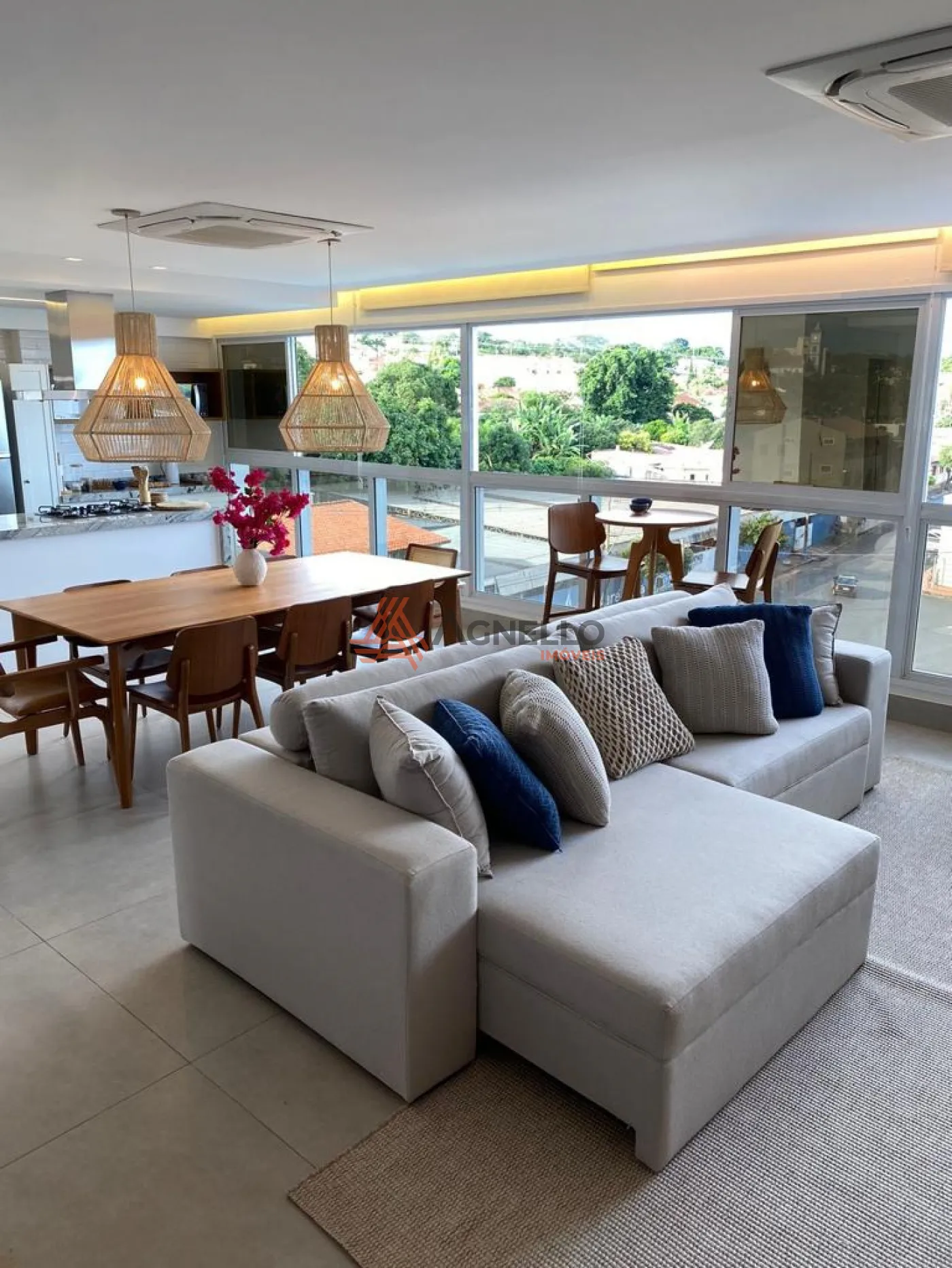 Apartamento com fino acabamento, mobiliado, possuindo 3 suítes, ampla sala em conceito aberto para 3 ambientes, lavabo, cozinha americana com ilha e 2 vagas de garagem.