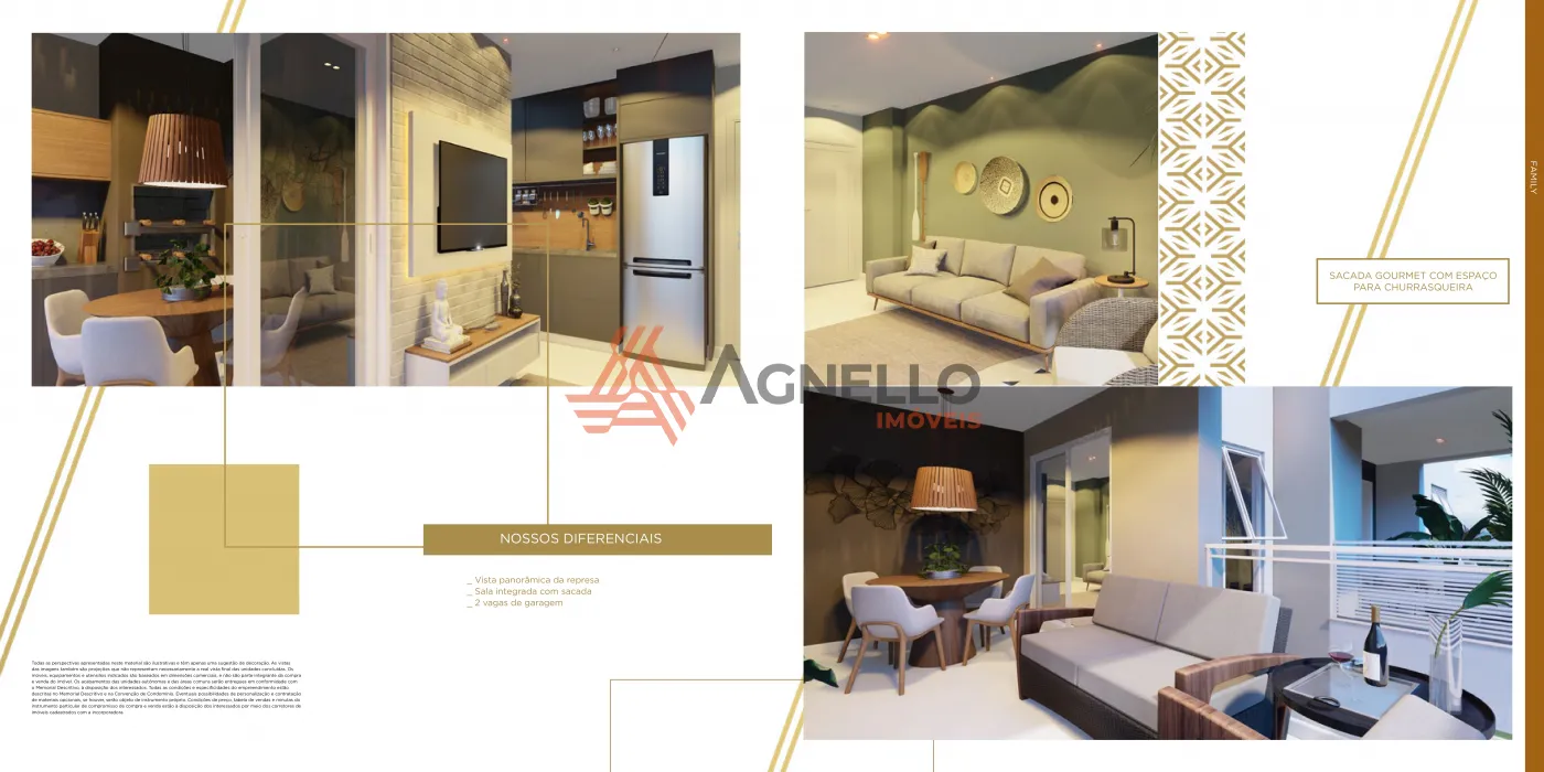 Apartamento, com dois dormitórios sendo uma suíte, sala de estar/TV, cozinha e varanda gourmet integrados, lavanderia, banheiro social e duas vagas de garagem.