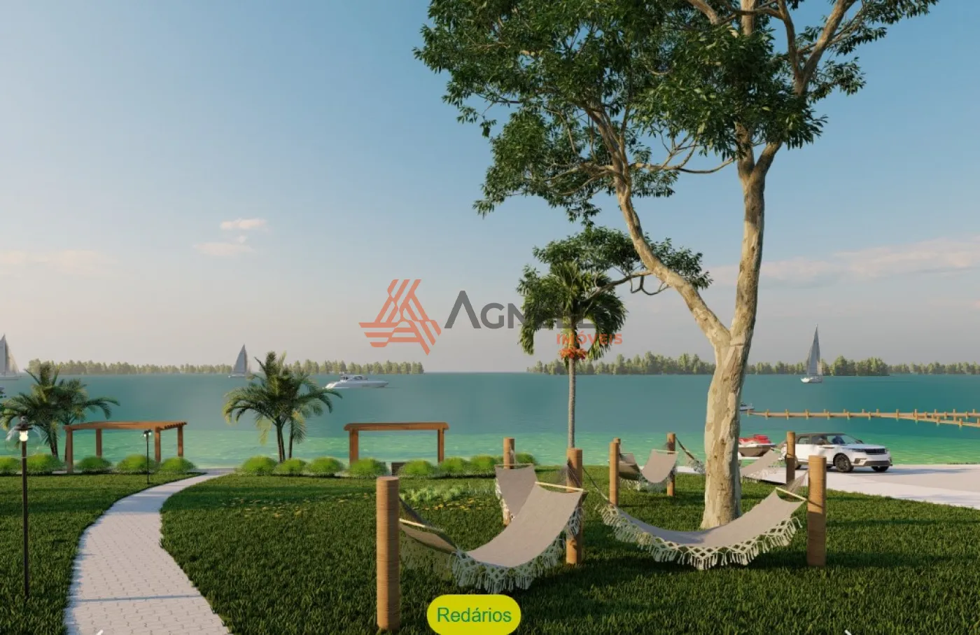 Condomínio com praia com pergolado, pier exclusivo, playground, área gourmet, fireplace, rampa para barcos, quadra de beach tennis e redário.